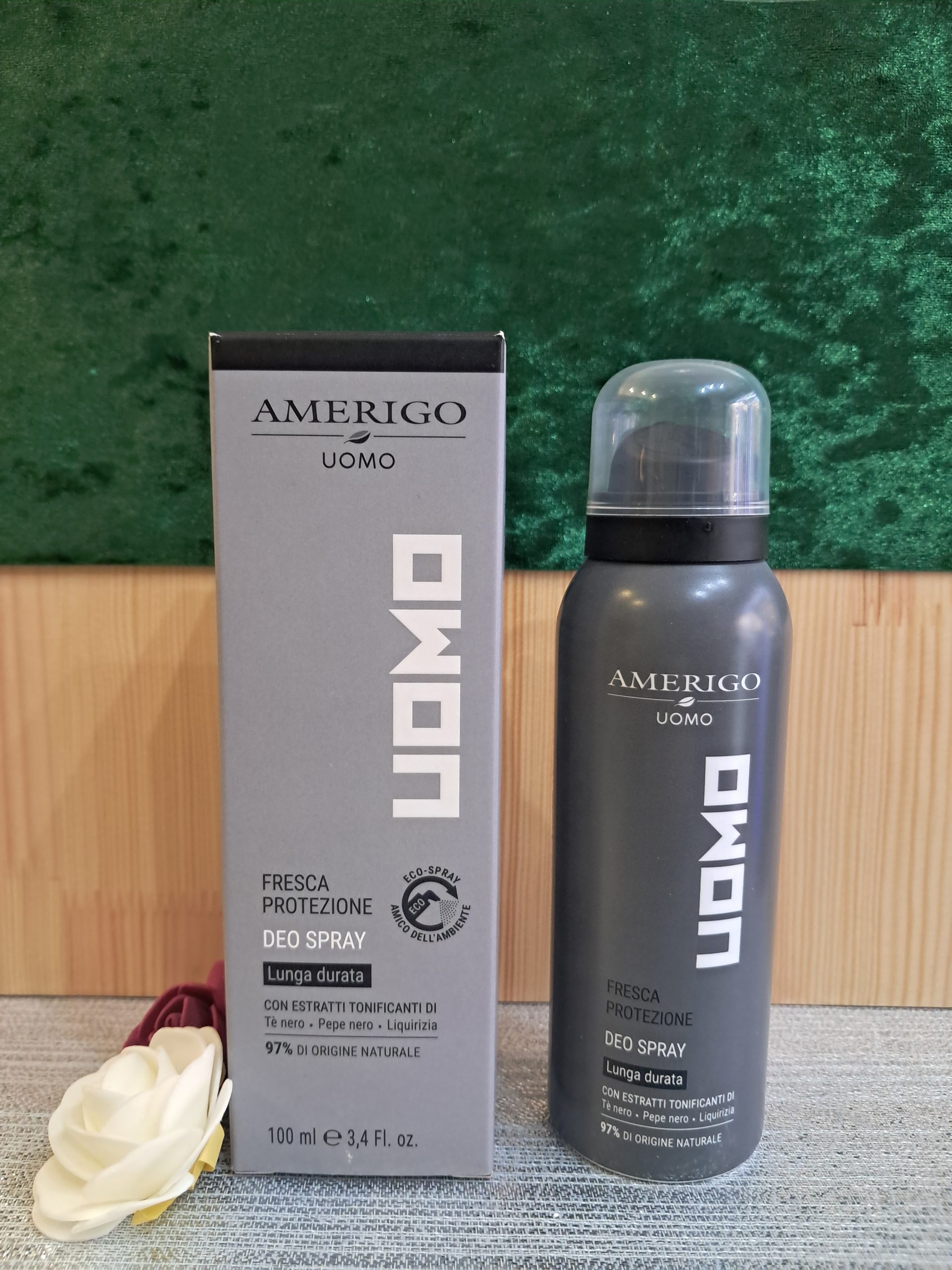 Il Deodorante Spray Amerigo offre una protezione a lunga durata, perfetta per le pelli più sensibili. Grazie alla sua formula vegana, arricchita con ingredienti BIO come pepe nero, liquirizia, tè nero e acqua di zenzero BIO, protegge la pelle dalla formazione di cattivi odori senza bloccare il naturale processo di traspirazione. Con un contenuto di nickel inferiore a 0,0001%, è delicato e sicuro, garantendo freschezza e comfort per tutta la giornata. Disponibile nel formato da 100 ml.